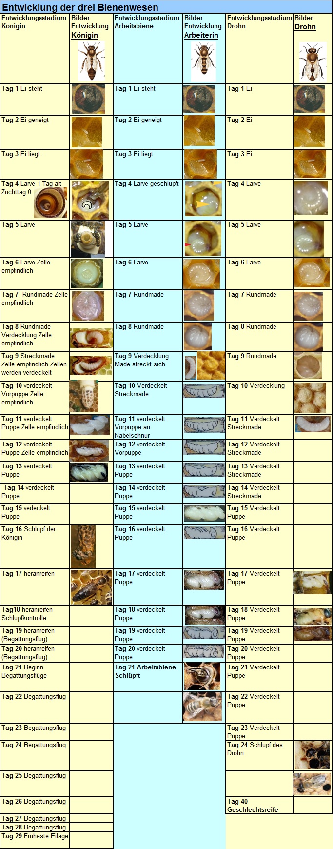 Entwicklung der drei Bienenwesen Arbeitsbiene, Königin, Drohn