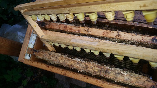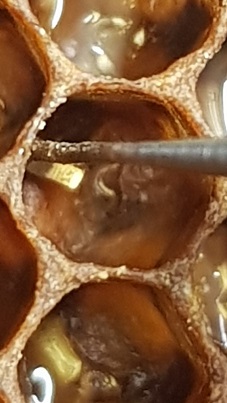 Tätigkeit heute: | Zellen schützen, wenn um 20 uhr umgelarvt wurde, sind Zellen ab 8 uhr morgens verdeckelt wurde morgens umgelarvt restliche Zellen wo gestern noch nicht verdeckelt waren schützen. -Etwas Honig und Puderzucker-Honigteig in Zellschützerbodenschlitze, dass geschlüpfte Königinnen versorgt sind. Weiselloses Schlupfvolk erstellen |