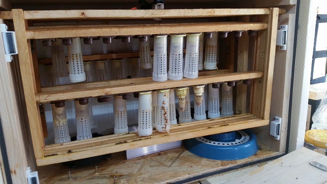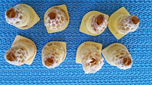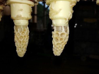 Tätigkeit heute: | -(Verdecklung)Tag 8,Zellen schützen, Zellen werden nach 8,5 Tage Verdeckelt -Etwas Honig und Puderzucker-Honigteig in Zellschützerbodenschlitze, dass geschlüpfte Königinnen versorgt sind. -Umlarvuhrzeit beachten, wenn morgens bis 9 Uhr umgelarvt wurde sind sie heute Abend 21 Uhr Zellen verdeckelt.8Tage+12 Stunden -Wenn später umgelarvt dann erst am anderen Morgen verdeckelt, ist auch vom alter des Zuchtstoff abhängig. -Zellen brauchen nur noch Wärme. -Absperrgitter kann jetzt am Hürdenrahmen entfernt, werden sofern heute schon alle Zellen geschützt sind. Da Zellen dann durch Schutzkäfige geschützt sind. -Ein teil Zellen in Brutschrank geben. -Pflegebienen 7 tage alt und älter wenn weitere Serien geplant, müssten erneut Pflegebienen rein, |