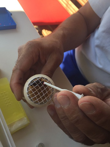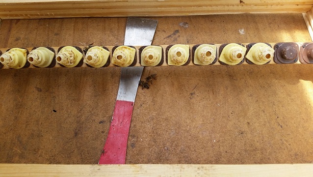 Tätigkeit heute: | -Schlupfreife Zellen in Weisellose Einheit gekäfigt geben, um dort schlüpfen lassen, beziehungsweise aus Brutschrank in Ableger usw. verwenden. -Etwas Honig und Puderzucker-Honigteig in Zellschützerbodenschlitze, dass geschlüpfte Königinnen versorgt sind. |