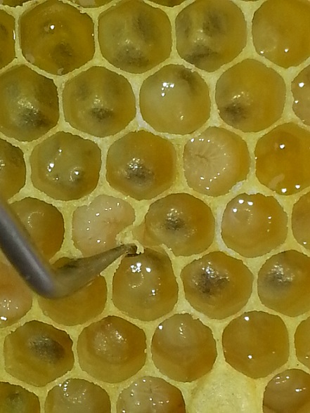 Tätigkeit heute: | -Nachschaffungszellen im Sammelbrutableger brechen und Probezuchtstoff oder offene Brut geben um Gelee Royal Produktion aufrecht zu halten. -Wenn um 10 uhr Serie Probe umgelarvt wird sind 4 Tage später um 22 Uhr Zellen verdeckelt,am 5. Tag morgens um 7 Uhr können diese entnommen werden und dann um 9 uhr Serie 0 Zuchtstoff rein. -offene markierte Brutwaben rein, dass Gelee Royal Produktion nicht abreißt, diese Markierte am Umlarvtag entnehmen. -Sonst schlüpft Nachschaffungskönigin vor Umlarvtag 0. -Heute Schlupf der Pflegebienen im Sammelbrutableger,somit sind Pflegebienen am Umlarvtag 8 Tage alt. -Futtertasche mit Honigwasser 1:1 einhängen mit Stroh, oder von oben füttern, Pollenwabe in nähe von Zuchtrahmen hängen, dass Ammenbienen viel Gelee Royal erzeugen können. |