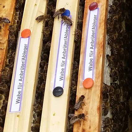 Zuchttag -26: Brutwaben mit 2-3 Tage alte Larven in mehrere Völker für späteren Sammelbrutableger und Pflegevolk markieren.